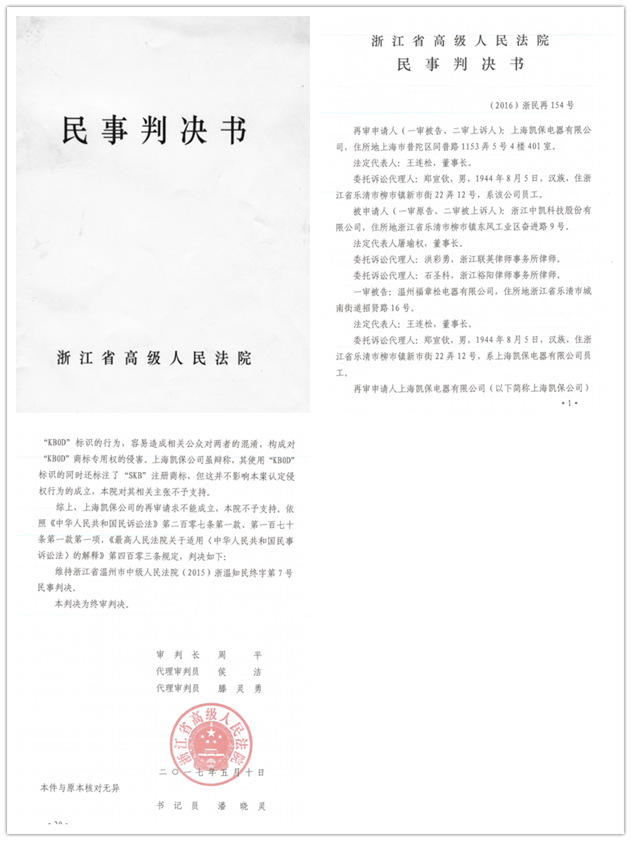 2017年5月10日,浙江省高級人民法院作出終審判決,中凱一場歷時三年的商標(biāo)維權(quán)案終于塵埃落定。本案得從2014年3月說起,因上海凱保長期蓄意侵害中凱商標(biāo)權(quán),在產(chǎn)品包裝盒、產(chǎn)品標(biāo)牌、企業(yè)官網(wǎng)、產(chǎn)品樣本、廣告等媒介平臺上大量使用與中凱KB0、KB0J、KB0D等商標(biāo)相似或近似字樣,并有意作一些誤導(dǎo)消費者的宣傳,被中凱訴至法院。樂清市法院受理此案后,通過大量的調(diào)查了解,以大量的事實證據(jù)為依據(jù),認(rèn)定上海凱保侵權(quán)事實成立,判令上海凱保停止侵權(quán),賠償損失。上海凱保不服,上訴到溫州市中院,溫州市中院通過對案件的審查,最終在充分的事實和證據(jù)基礎(chǔ)上作出了維持一審判決的二審判決。上海凱保為達(dá)到其不可告人的目的,使出一套“纏”和“拖”的絕技,對二審法院的判決仍然表示不服,向浙江省高院提出再審申請。省高院受理案件后,開庭再審該案,在大量的事實和證據(jù)面前,最終作出了維持溫州市中院二審判決的終審判決。這一判決,標(biāo)志著一些別有用心,惡意侵害或蓄意侵占中凱商標(biāo)權(quán)的不法行為的破滅。