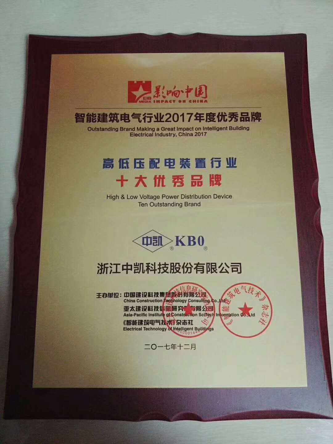 20171219日,從北京傳來好消息,我浙江中凱科技股份有限公司再次被評選為2017年度影響中國智能建筑電氣行業(yè)高低壓配電裝置十大優(yōu)秀品牌,這是我公司自2016年以來,連續(xù)第二次獲此殊榮。本次評選的2017年度高低壓配電裝置十大優(yōu)秀品牌分別由浙江中凱和ABB、施耐德、西門子、常熟開關(guān)等業(yè)內(nèi)十家領(lǐng)軍企業(yè)斬獲。