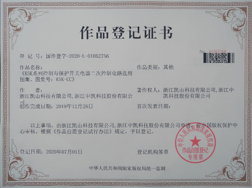 近日,國家版權局頒發作品登記證書,由浙江中凱科技股份有限公司全資子公司浙江凱山科技有限公司為著作權人的兩本在工程設計及應用中的標準設計圖集獲得作品登記。兩本圖集分別為XLCPS系列控制與保護開關電器二次控制電路選用圖集》(圖集號XLCPS-CC)、《KSK系列控制與保護開關電器二次控制電路選用圖集》(圖集號KSK-CC)。